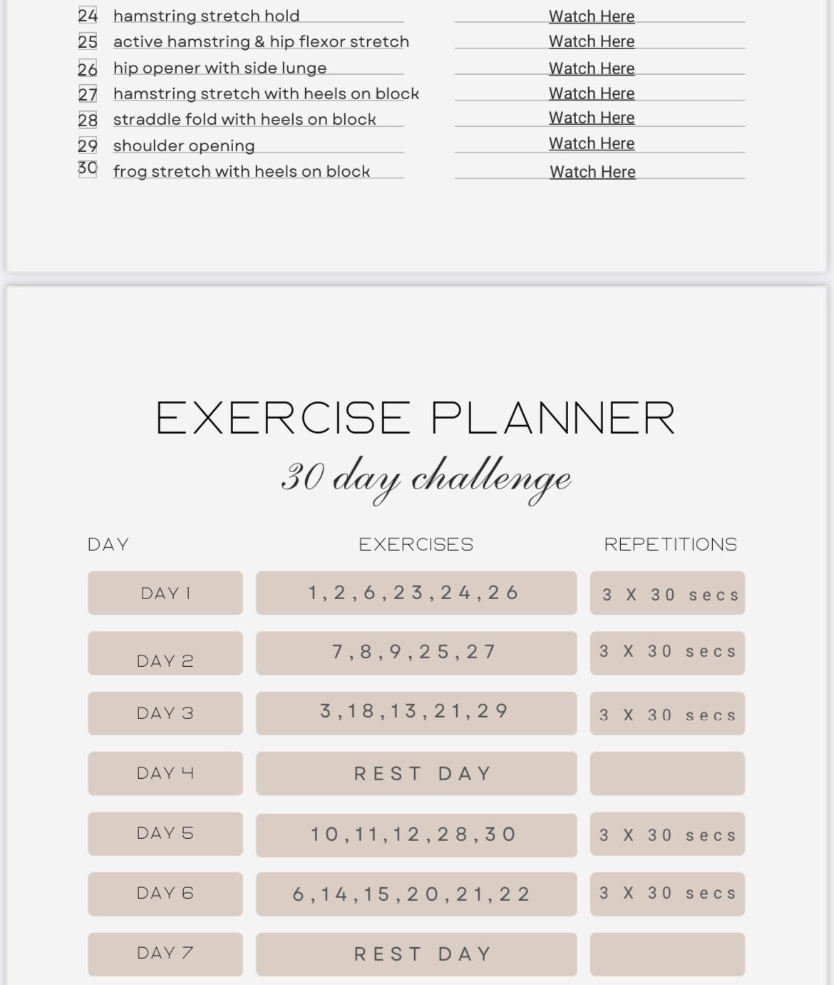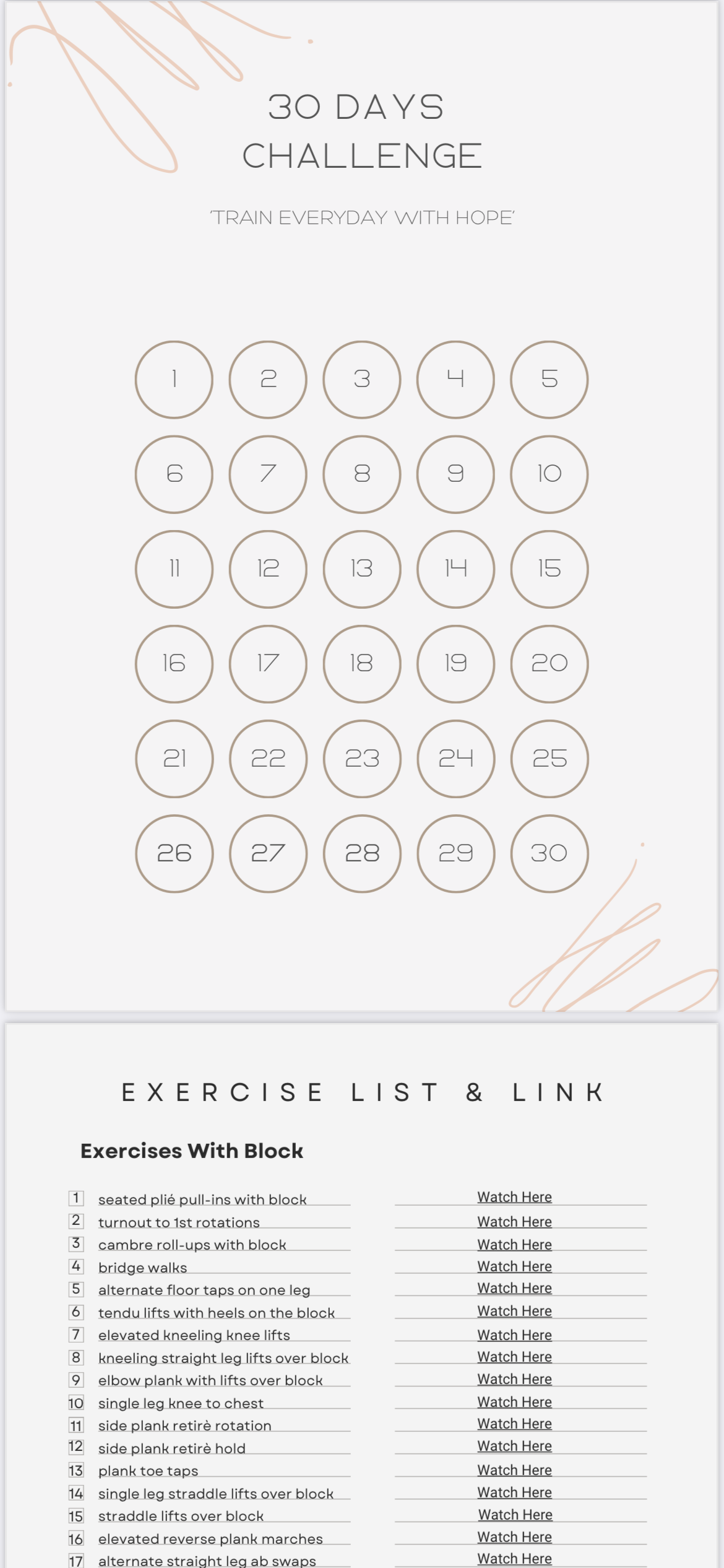 This 30-day challenge is designed for dancers, athletes, or anyone looking to improve their body’s strength, range of motion and overall tone. Whether you’re looking to enhance your dance performance, recover from injury, or simply get stronger and more flexible, this programme will guide you through daily routines that build endurance, improve posture and increase flexibility—all while increasing your core strength and overall body awareness.